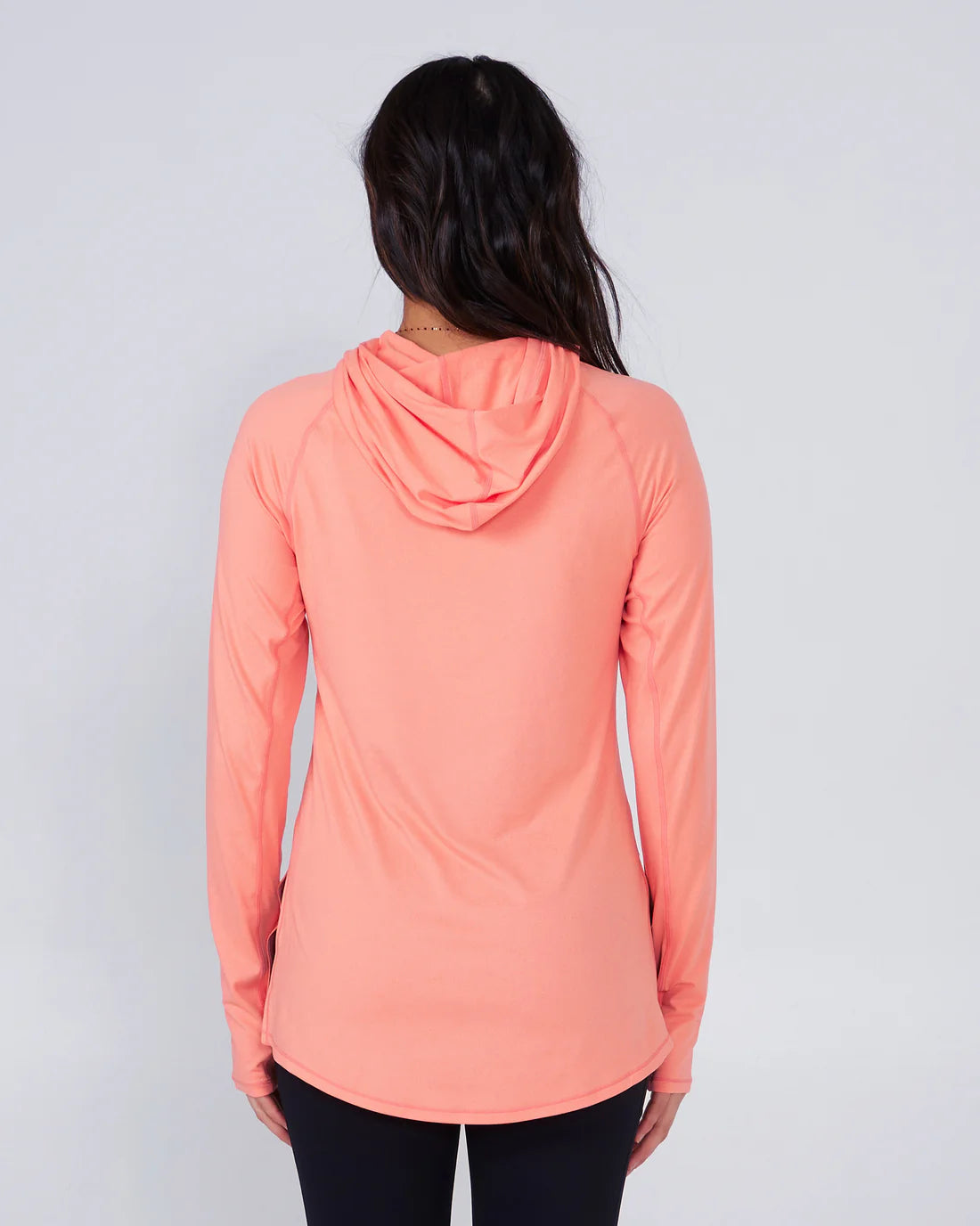 Body skimming fit with scuba hood with high neck and drawcord / Side seam slits and thumbholes at sleeves / Moisture wicking and 4-way stretch