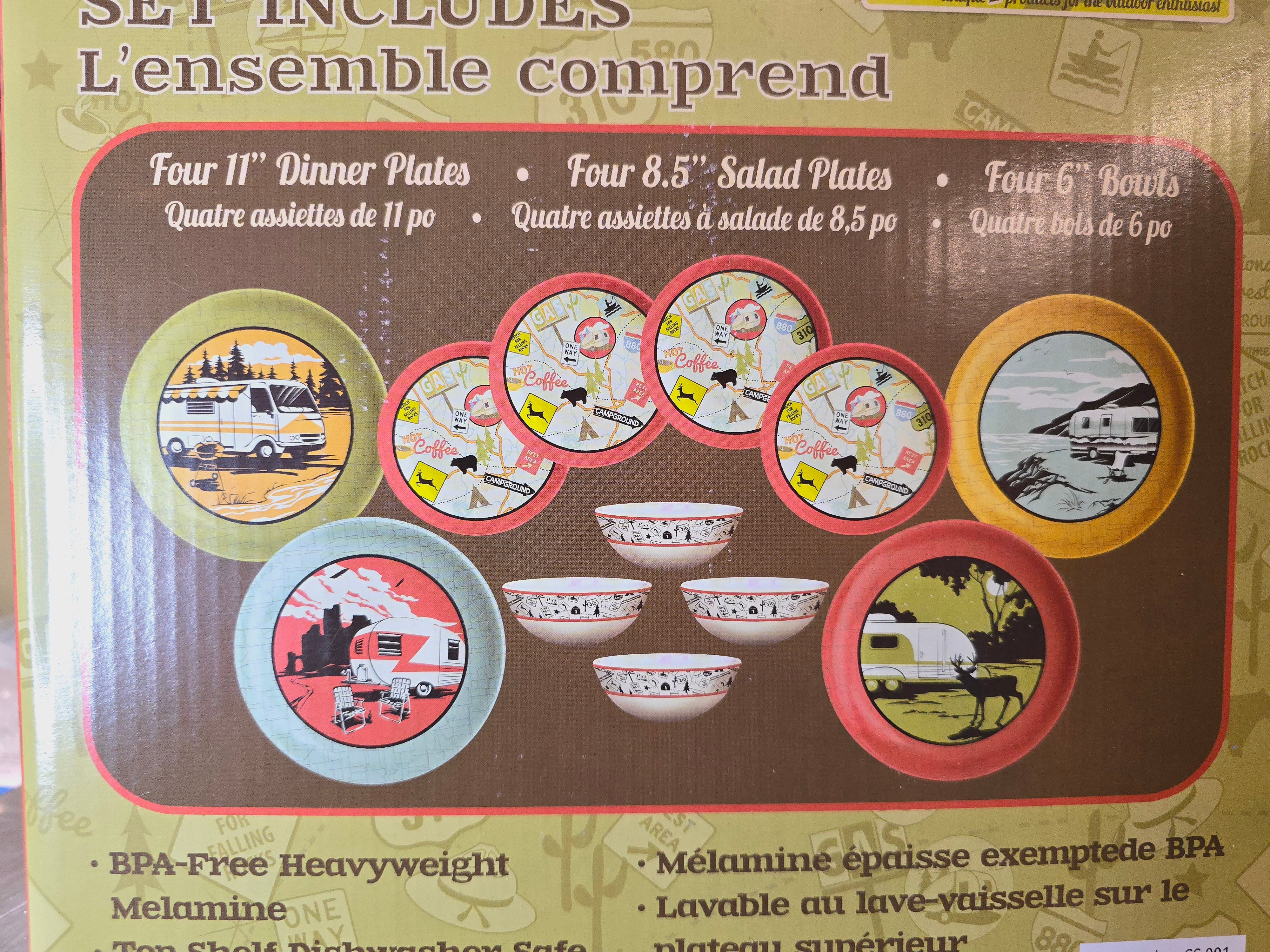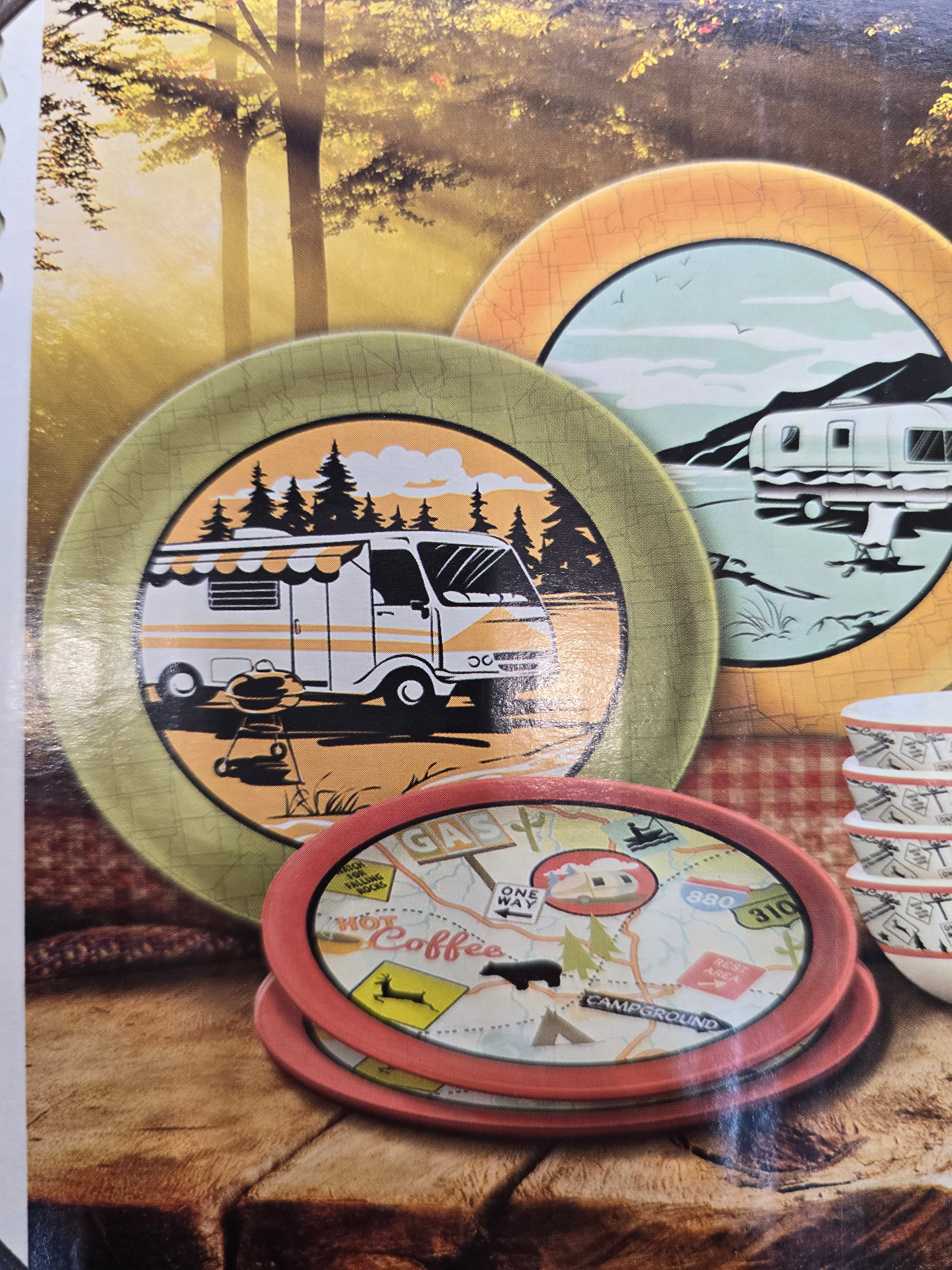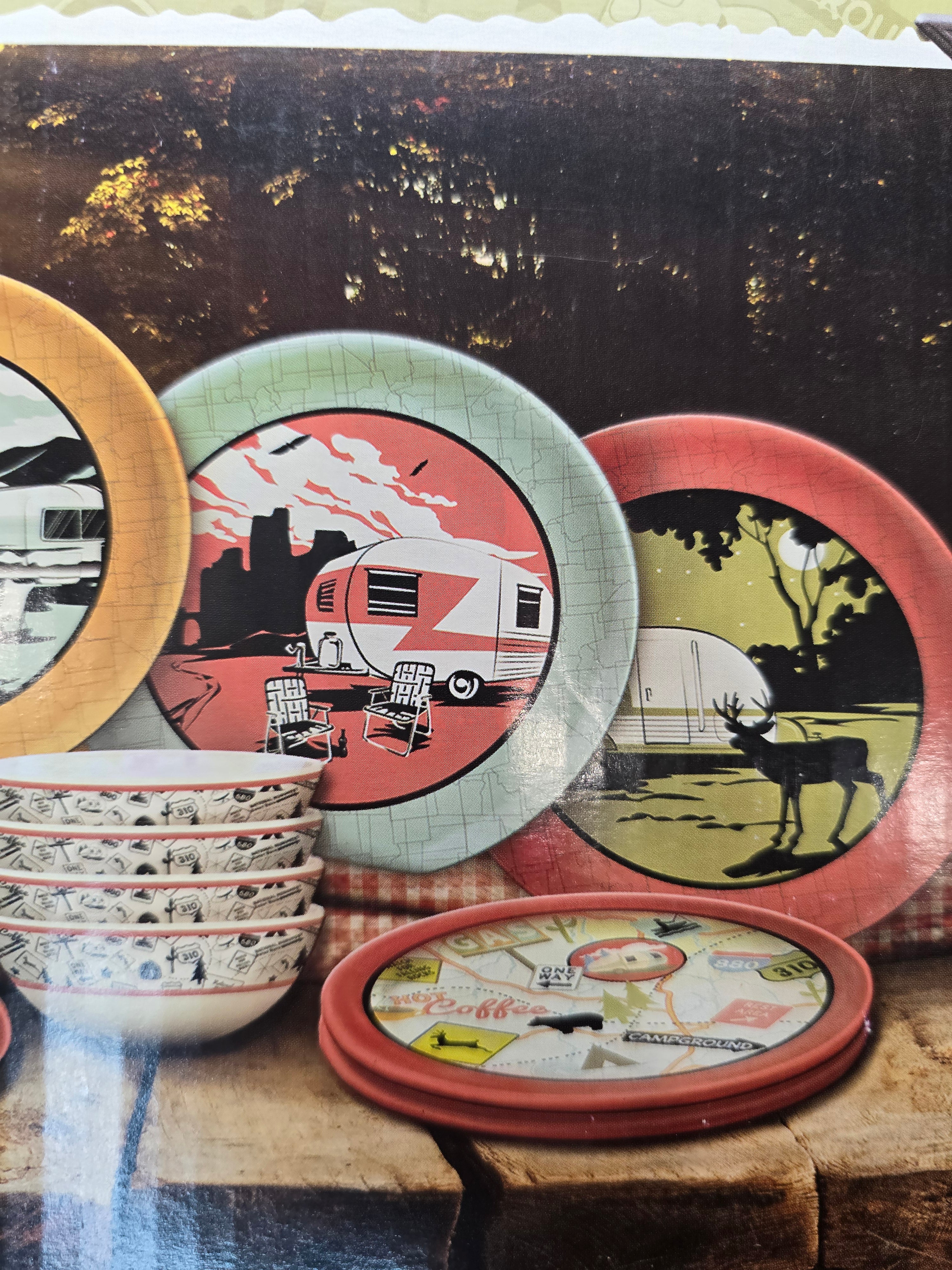 Add style to any activity! This unique dish is a perfect gift for those outdoor enthusiasts everywhere! The set includes 4 - 11" Dinner Plates, 4 - 8.5" Salad Plates, 4 - 6" Bowls!