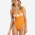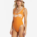 Featuring a floral graphic across the chest, the On Island Time one-piece swimsuit is a retro cut with a scoop neck and a high-leg rise that flatters your curves. Crafted of our recycled Peach Stretch fabric for strength, softness, and 4-way stretch.