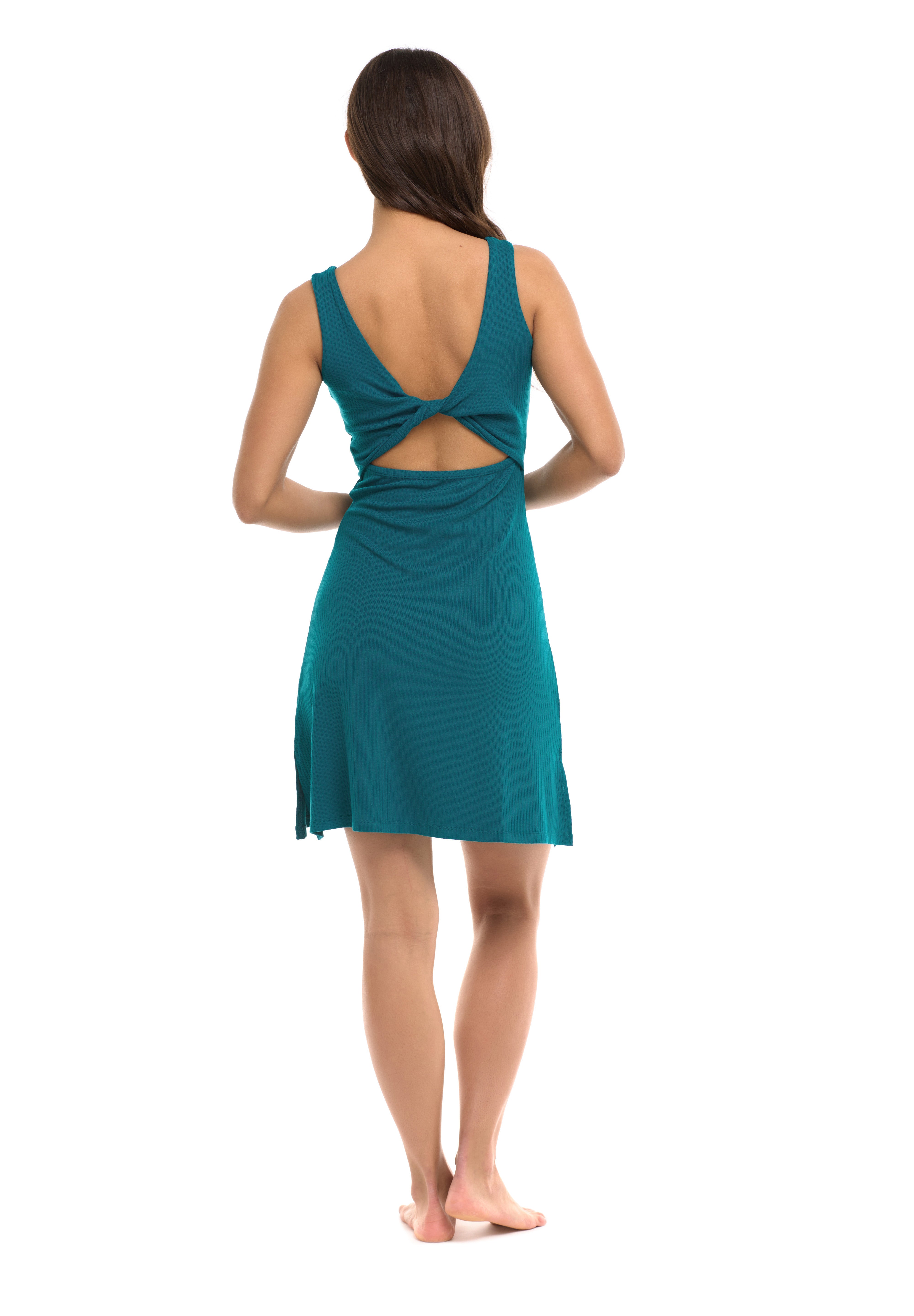 Introducing the versatile Syra dress: Discover comfort and style in ribbed knit rayon fabric. With a side slit and unique back-to-front option, it's your key to fashion freedom. The keyhole twist drape front adds intrigue, while the knee length and full coverage back offer a chic finish.