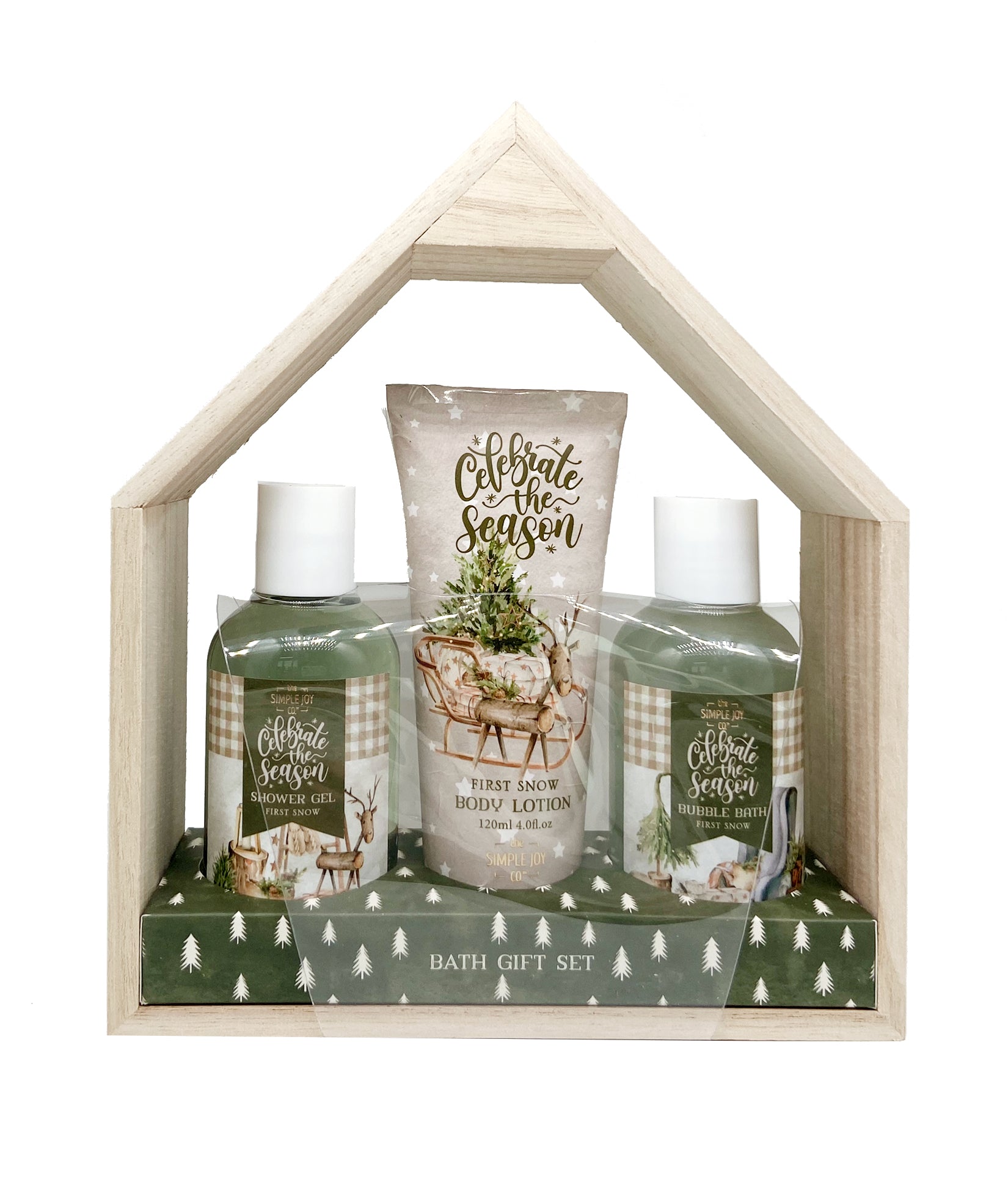 Make gift giving for the holiday season and easy and special one with this Bath Gift Set. This First Snow scented set of 4 gift set includes: Shower Gel (150 ml), Bubble Bath (150 ml) & Body Lotion (120 ml) nestled in a Paulownia Wood House design tray. FDA certified Not tested on animals. Shower Gel, Bubble Bath, Body Lotion, PET, Polypropylene, PE & Paulownia Wood. |