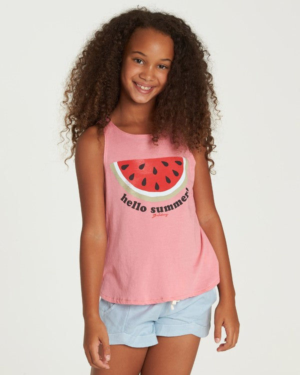 Rock a slice of summer vibes. The girls graphic tank top features a watermelon and “Hello Summer” print at the center front and a swing silhouette. Made from soft modal blend jersey, the tank offers an easy drape and A-line cut. |