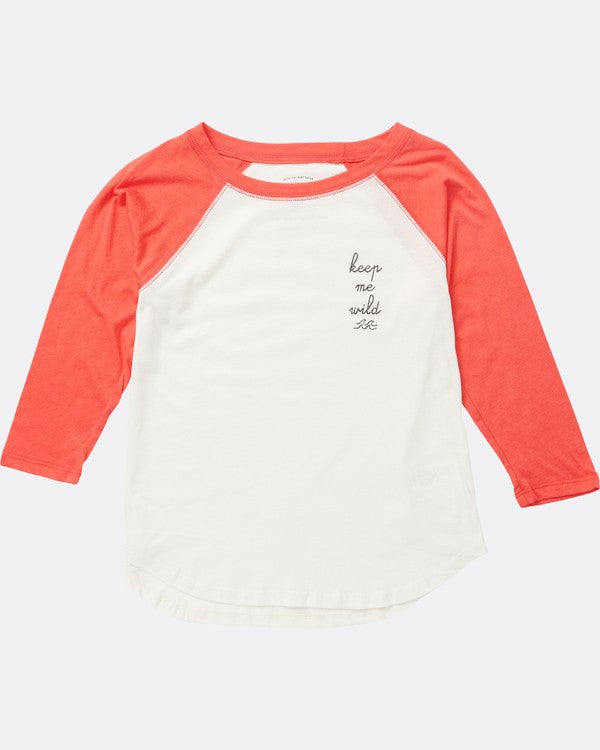 You keep doing you. “Keep Me Wild” artwork is printed onto the chest of a throwback raglan sleeve t-shirt. The 3/4 sleeve tee features a rounded hem and contrast sleeve and neck. |