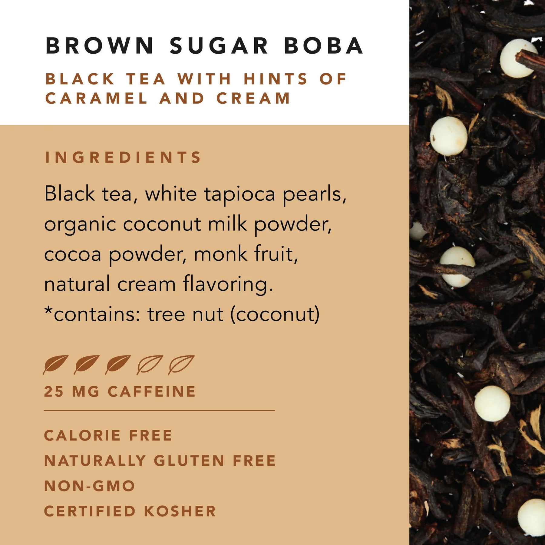 All the indulgence of your favourite boba tea, none of the guilt! Our delicious calorie-free Brown Sugar Boba tea is made from whole leaf black tea and real tapioca pearls with coconut and cocoa.