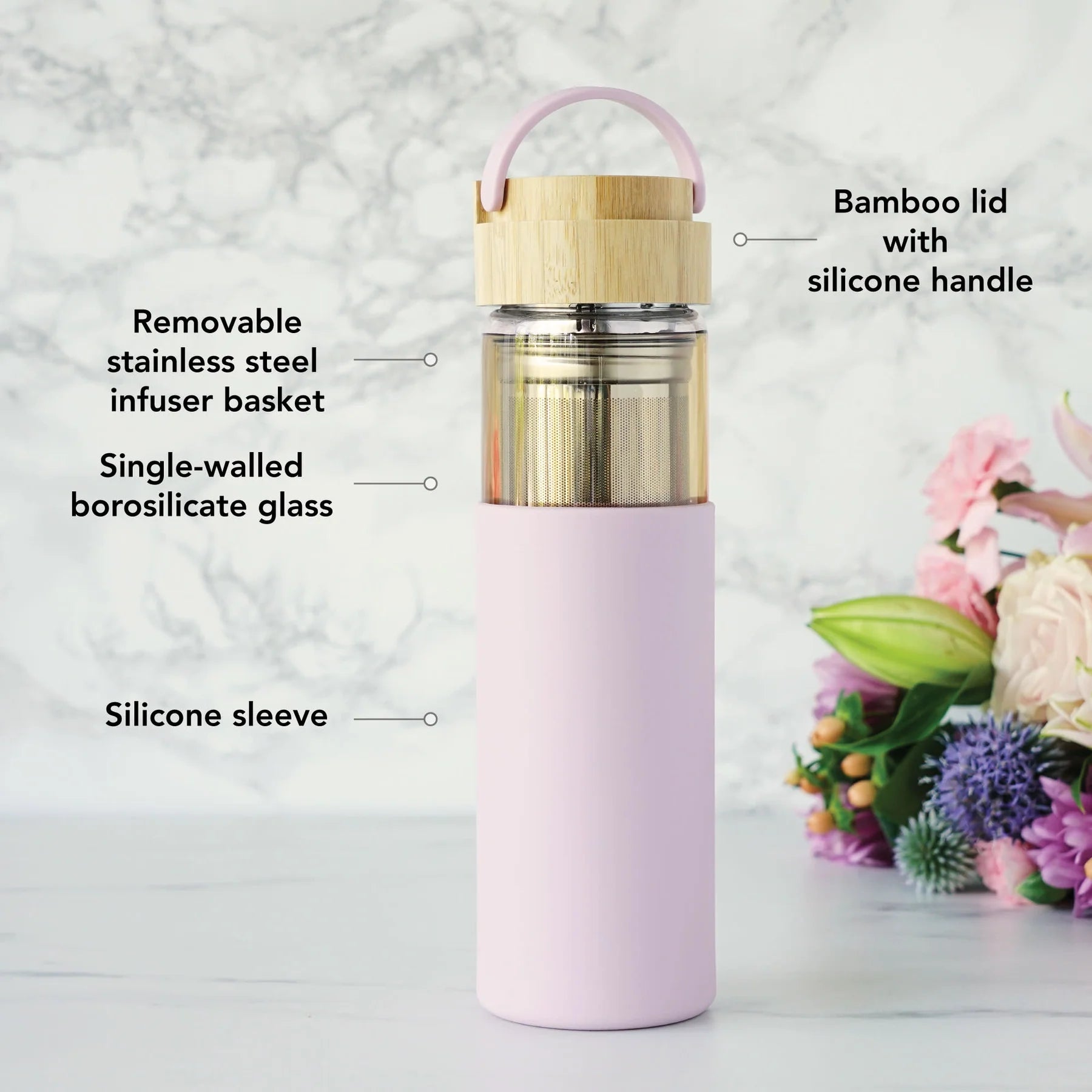 With its monochrome design, tinted single-walled glass, and silicone sleeve, the Dana Travel Infuser Mug is a stylish way to bring your favorite loose leaf tea on the go. Includes a removable stainless steel strainer and a bamboo lid with a handle for easy transportation.