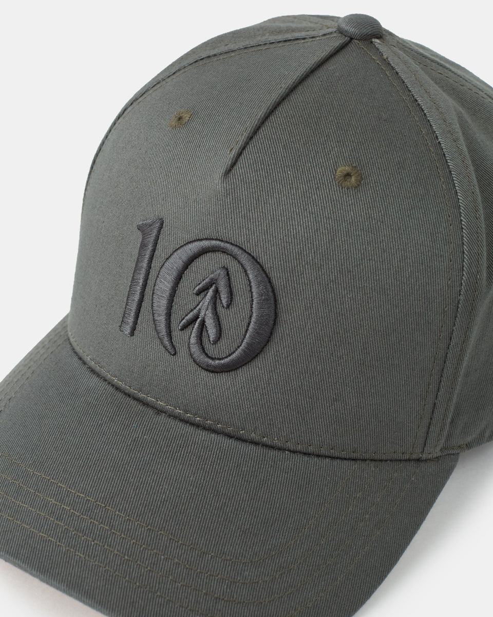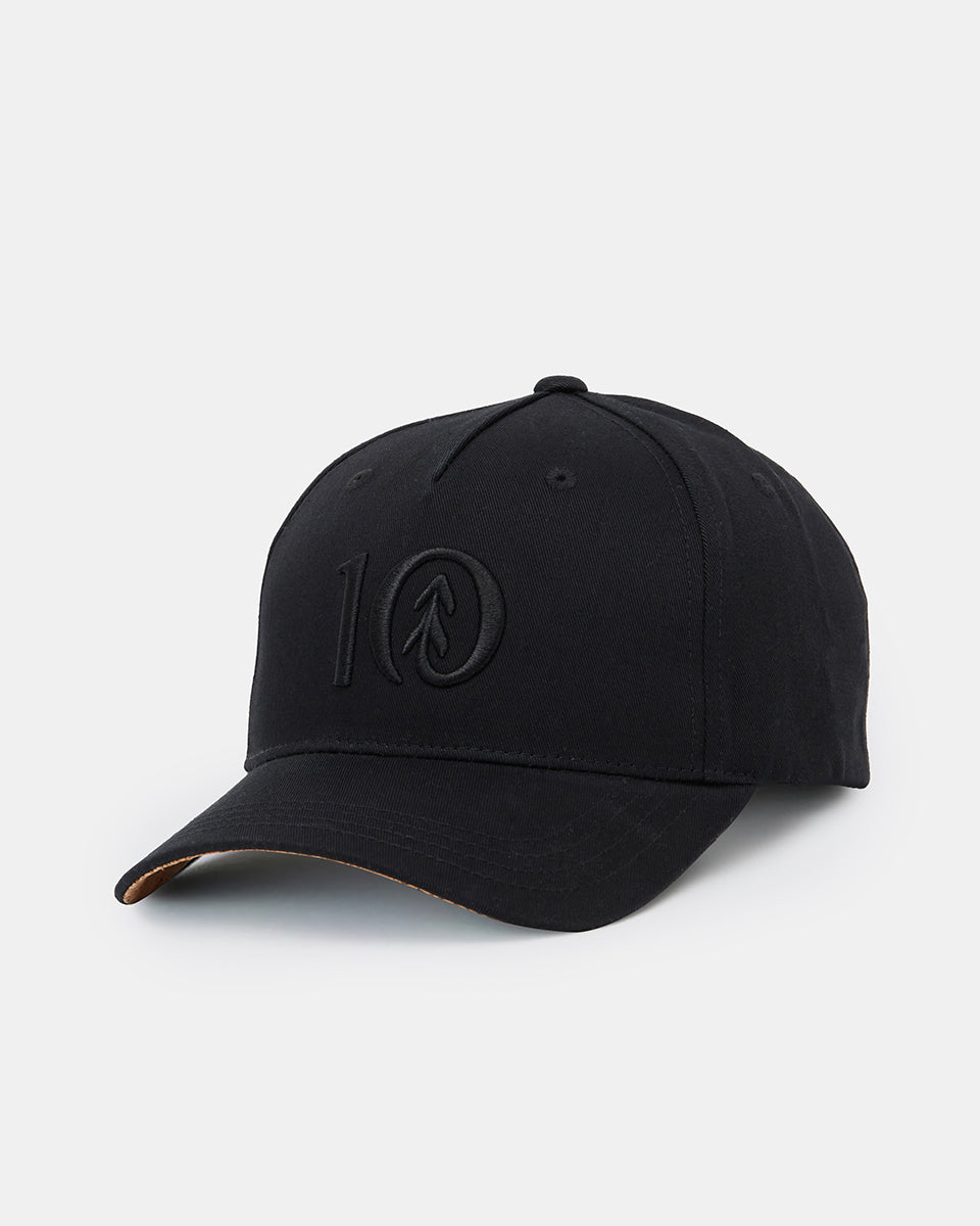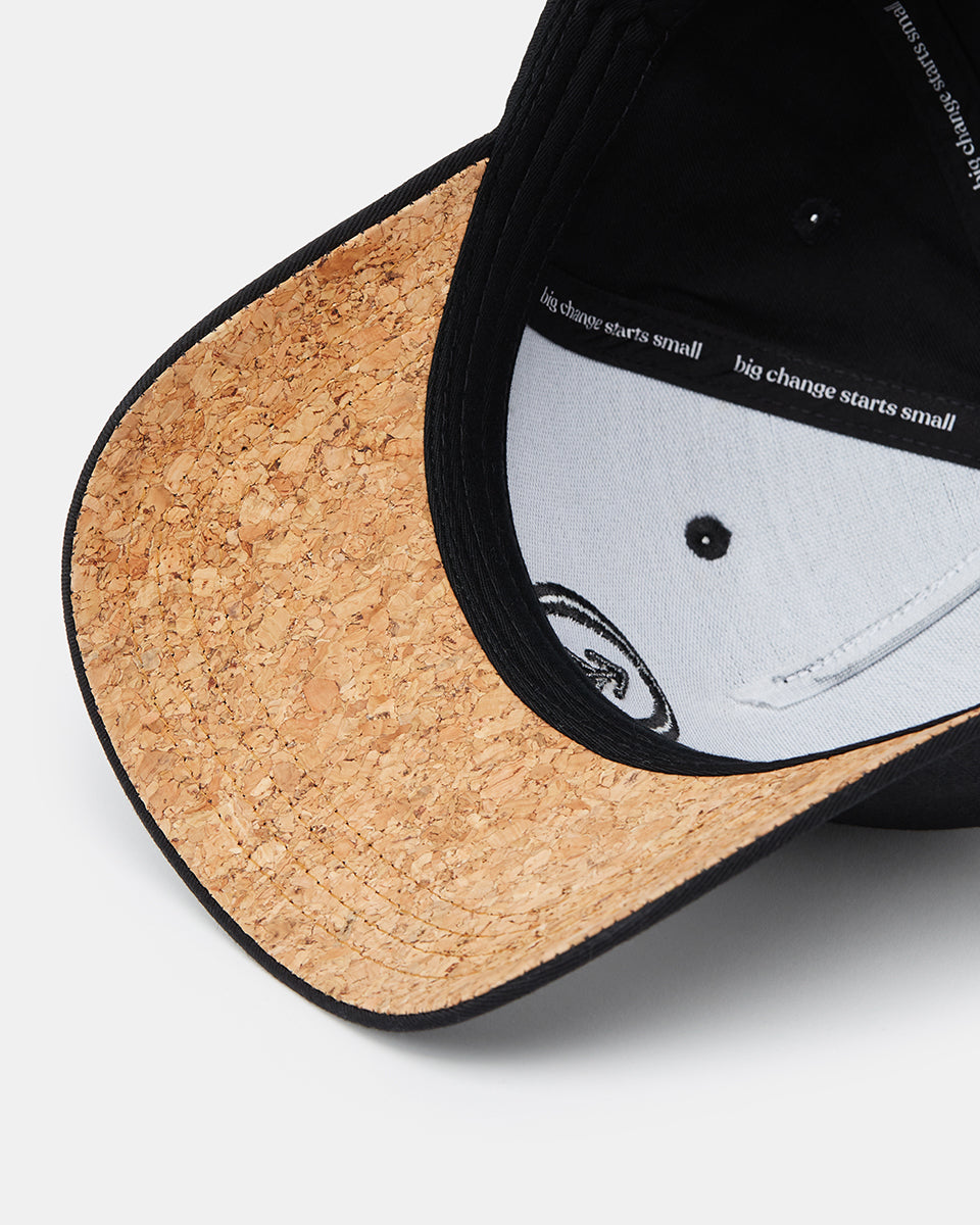 Snap closure- Curved recycled plastic brim - Raised embroidered 10 logo- Cork panel on underside of brim- Cork label flag at back closure